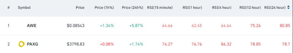 PAXG, a tokenized form of gold, is trading near $3,798.83 with a 1.74% gain in the past 24 hours. Its RSI readings show overheating across multiple timeframes: the one-hour at 76.76, four-hour at 86.32, the 12-hour at 78.85, and daily at 78.7, all well above the overbought threshold.