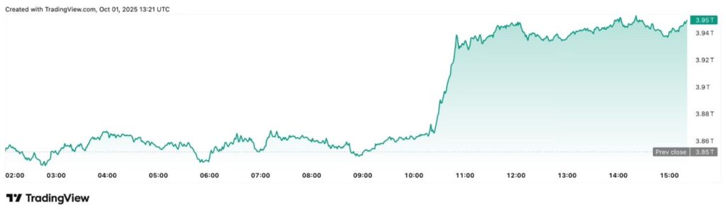 Shortly after, the figure climbed even further, hovering around $3.95 trillion market cap at press time, according to TradingView data retrieved by Finbold.