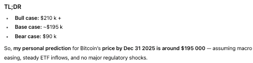 In coming up with the December 31 price outlook, ChatGPT’s model began with a 2024 closing price of about $95,000 and a mid-October 2025 level near $113,000.