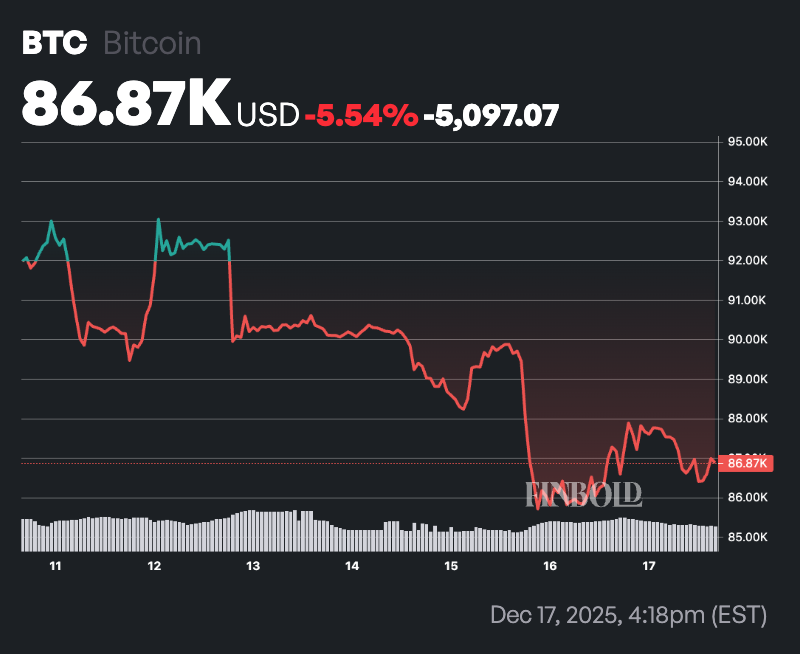 By press time, Bitcoin was trading at $86,877, down 0.4% over the past day. On the weekly timeframe, the asset was also in the red, lower by 5.5%.