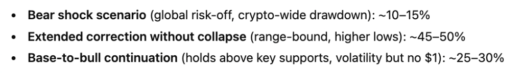 Overall, ChatGPT assigned a relatively small probability to a full bear-shock scenario involving a broad crypto drawdown. The most likely outcome is seen as an extended correction with range-bound trading and higher lows, while a base-to-bull scenario in which XRP holds key support despite volatility is also considered plausible.