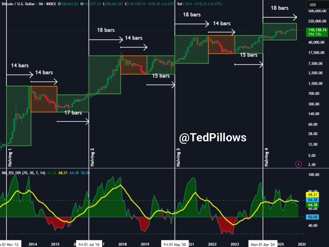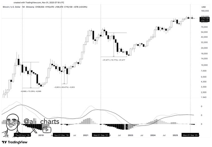 In an X post on November 1, Pillows stated that in past cycles, Bitcoin typically set new all-time highs after its halving event, followed by a rapid, euphoric surge and a sharp correction of 60% to 70%.