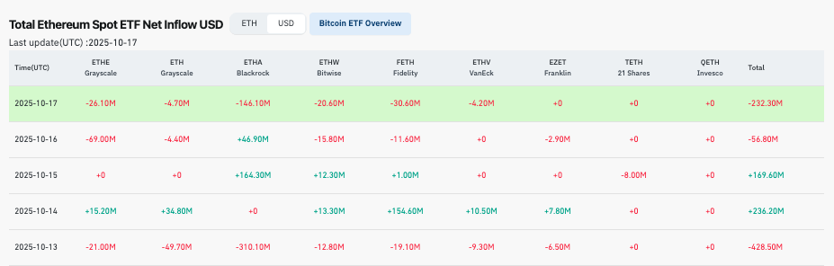 Ethereum ETFs also ended the week in the red, posting an aggregate $232 million net outflow across issuers.
