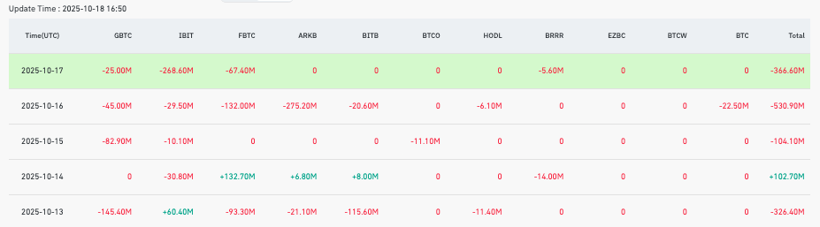 Specifically, the asset manager’s Bitcoin (BTC) and Ethereum (ETH) spot ETFs collectively recorded a net outflow of approximately $524 million for the week ending October 17, 2025.