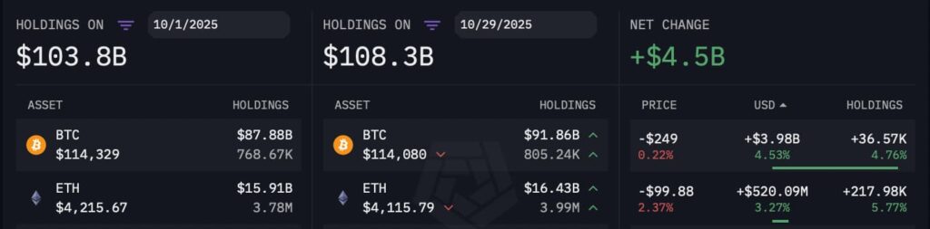 BlackRock’s October activity reflects this split approach. Between October 1 and October 29, 2025, the firm’s digital asset holdings jumped from $103.8 billion to $108.3 billion, according to wallet-tracking data.