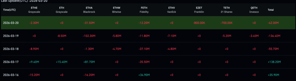 Meanwhile, BlackRock Ethereum (ETH) ETF showed greater volatility. The iShares Ethereum Trust (ETHA) recorded a strong $81.7 million inflow on March 17, but this was outweighed by sharp outflows of $102.3 million on March 19 and $31.5 million on March 20.