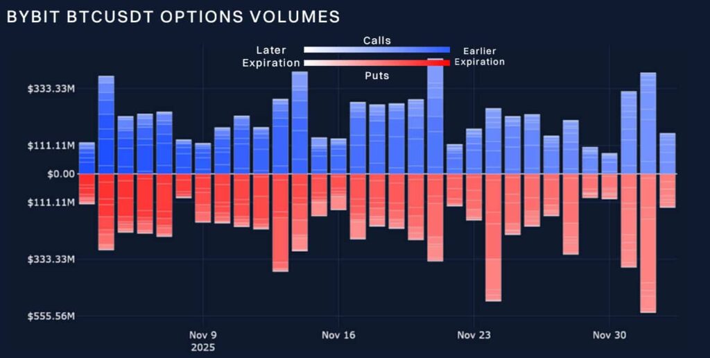 BTC options volumes showing a rebound in call activity and easing bearish positioning. Source: Block Scholes/Bybit