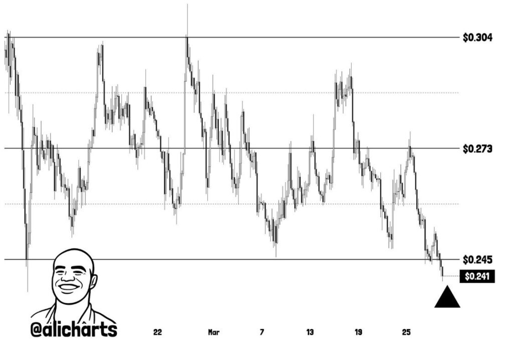 Last week, ADA price opened near $0.25 and finished at approximately $0.241 on Sunday, March 29. As a result of this drop, Cardano price confirmed a break of its multi-week support floor at $0.245, as highlighted by Martinez, who noted this level had held as a reliable bounce zone throughout the prior two months.