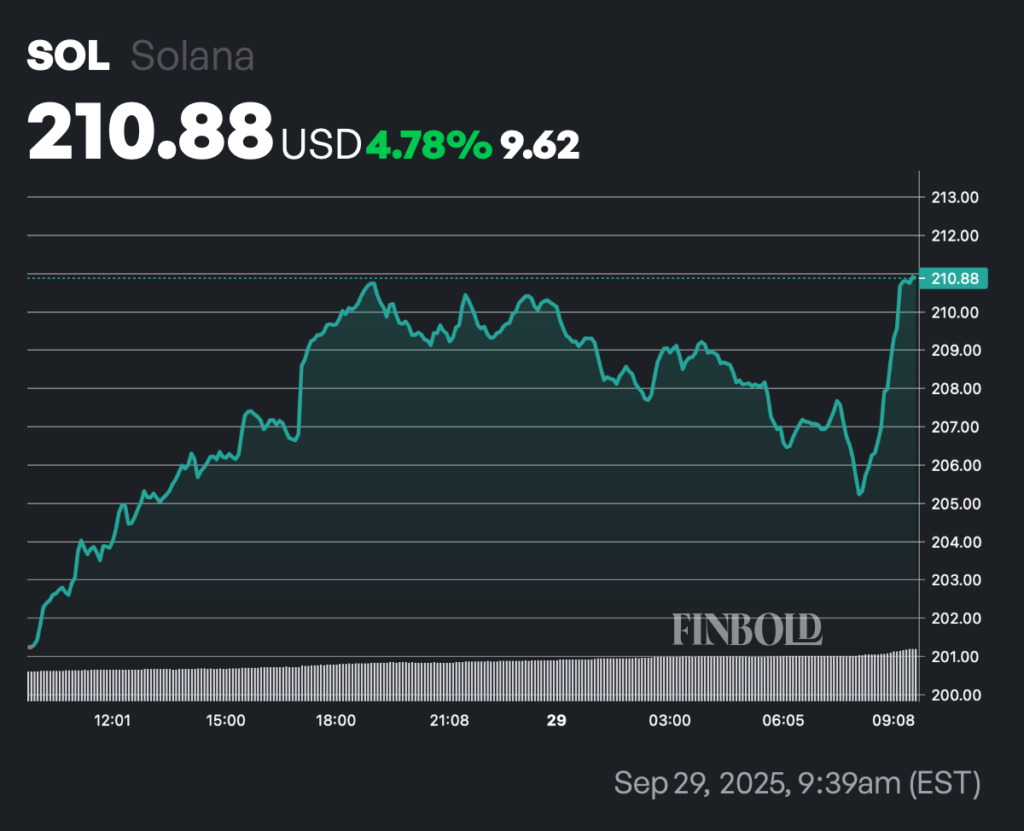At the time of writing, SOL was trading at $210.93, up 4.67% over the past 24 hours after plunging 20% last week.