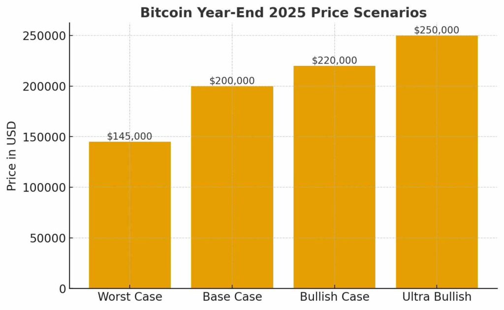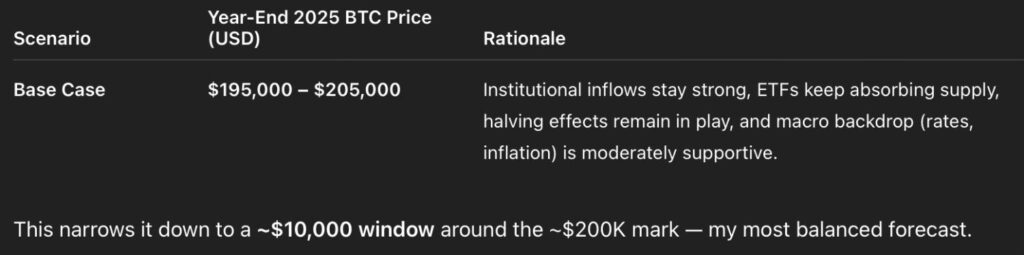 Prompted to make a narrower guess, the language learning model (LLM) suggested that the current price, institutional interest, and macro environment point toward a plausible year-end price between $195,000 and $205,000, with a central estimate of about $200,000.