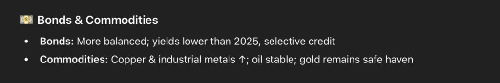 Equities are accordingly projected to remain constructive, but with more selective gains. Most notably, AI is going to remain the dominant structural theme, with capital spending on infrastructure, data centers, and semiconductors remaining a major tailwind.