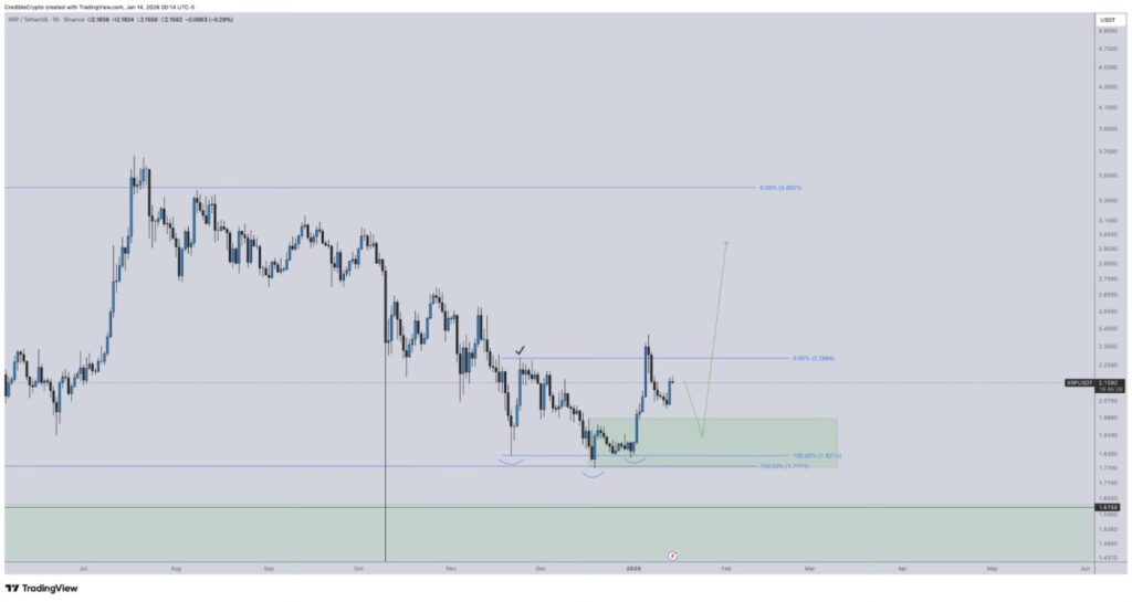 Technical indicators also support CrediBULL’s perspective, as XRP has reclaimed the $2.09 Fibonacci 50% retracement level and is holding above its seven-day exponential moving average (EMA) near $2.11. Momentum indicators have likewise turned constructive, with the MACD histogram moving into positive territory.