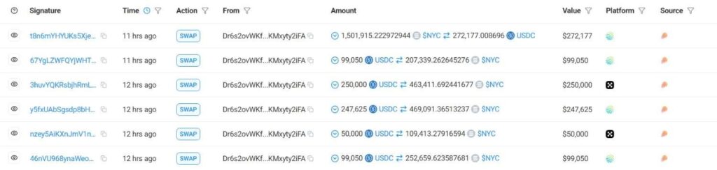 The six $NYC trades that resulted in the loss of approximatelly $473,000. Source: Solscan