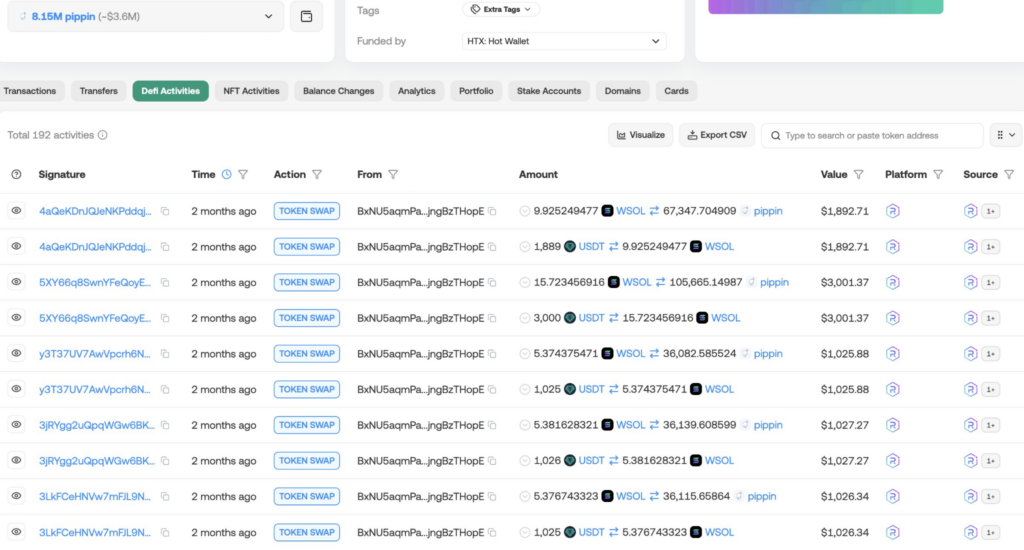 DeFi activity records indicate repeated USDT-to-WSOL conversions followed by WSOL-to-Pippin swaps, with individual trades capturing tens of thousands of Pippin tokens per transaction.