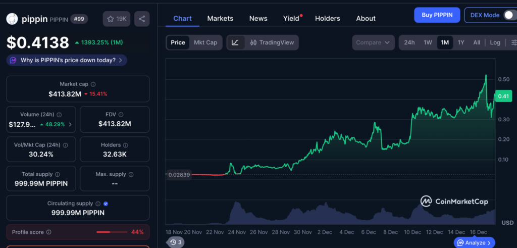 Since then, Pippin has staged a sharp rally. By press time, PIPPIN was trading at $0.4229, down about 10% over the past 24 hours. On a weekly basis, the token is still up nearly 30%, while monthly gains exceed 1,400%.