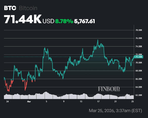BTC has steadily gained bullish momentum over the past 30 days. Bitcoin’s price climbed 8.78% to about $71,440 at the time of publication.