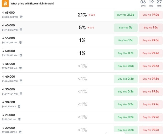 The chances of a capitulation to $50,000 is also 1%, with a volume of $3.2 million. Combined, these forecasts put the chance of Bitcoin trading below its current level by April 1 at about 29%, based on aggregated Polymarket data.