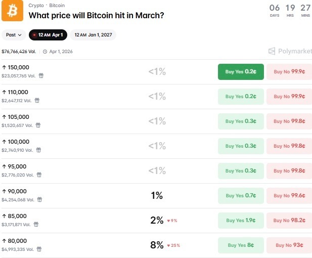 Conversely, on the upside, traders are pricing in an 8% chance that Bitcoin will spike to $80,000 by April 1, though this conviction has fallen around 25% over the past 24 hours. The likelihood of Bitcoin surging to $85,000 is 2%, down roughly 9% over the same period, while the feasibility of a rally to $90,000 is 1%. The $150,000 price target for BTC has the highest volume of $23 million.