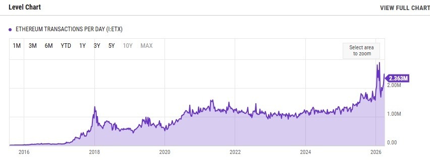 Since Ethereum’s quarterly transactions bottomed around Q4 of 2023, the figure has gradually climbed to its peak earlier this year. Specifically, the number of settlements recorded on the Ethereum network peaked at 2.897 million transactions per day on February 7, 2026, before dropping to about 2.363 million payments on April 2, as per data from YCharts, a research and analytics platform.