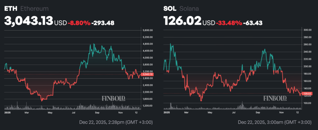 Notably, year-to-date, ETH has plunged almost 9%, trading at $3,040 as of press time. Over the same period, SOL has plunged 33%, trading at $126