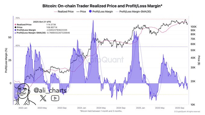 According to on-chain data shared by analyst Ali Martinez, Bitcoin’s trader profit/loss margin currently sits around -5%. Historical patterns show that when this margin drops below -12%, the cryptocurrency tends to rebound strongly, signaling the end of major downtrends.