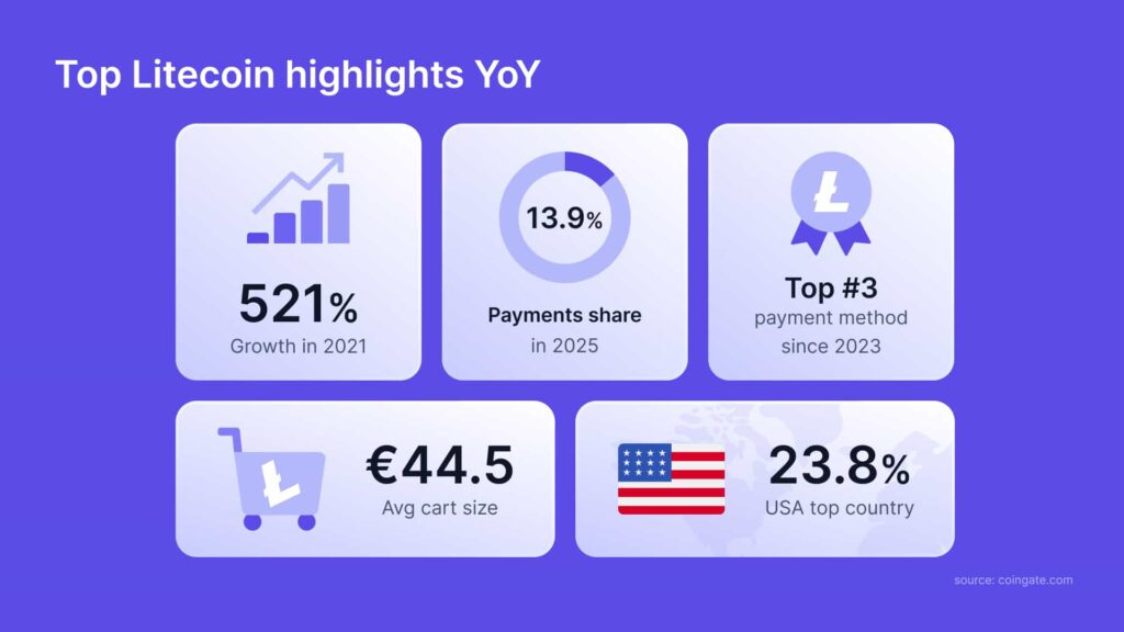 Following a breakout year in 2021, when processed Litecoin orders increased by 521% compared to 2020, usage has remained strong. In 2024, LTC payments increased by 52.7% year-over-year, marking their second-best year of growth. In 2025 so far (January–August), Litecoin accounts for 13.9% of all payments on CoinGate, behind only BTC (23%) and USDT (21.2%).