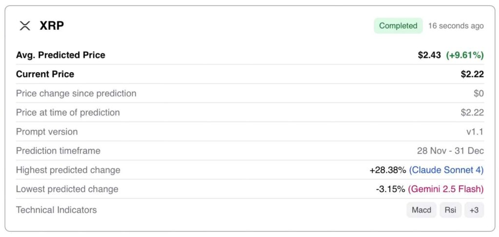 At first glance, the prediction agent’s forecast suggests the bullish atmosphere surrounding XRP appears justified. That is to say, the average XRP price target for the end of 2025, based on the joint efforts of ChatGPT, Claude Sonnet 4, and Gemini 2.5 Flash, sits at $2.43, which implies the token is up for a 9.61% rally over the next month compared to the current price of $2.22.