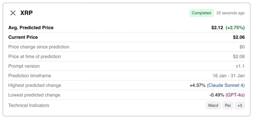 Namely, Finbold’s AI-driven price prediction tool, which blends inputs from ChatGPT, Gemini 2.5 Flash, and Claude Sonnet 4 to generate a range of potential outcomes, projects an average XRP price of $2.12 for January 31, 2026.