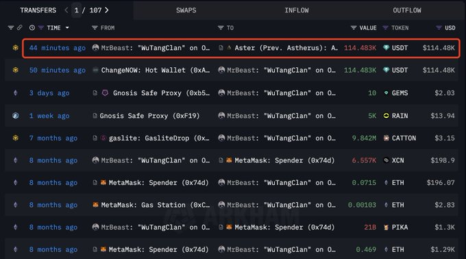 Blockchain data shows the transfer originated from a wallet labeled “MrBeast: WuTangClan” into Aster. This is the same wallet that has previously interacted with other exchanges and platforms, including inflows from ChangeNOW, Gnosis Safe Proxy, and multiple MetaMask transactions over the past year.