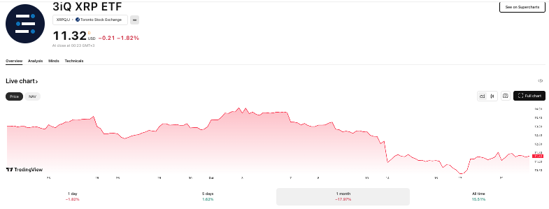 The 3iQ XRP ETF (XRPQ.U), listed on the Toronto Stock Exchange, has plunged nearly 18% over the past month to $11.32 as of October 22.