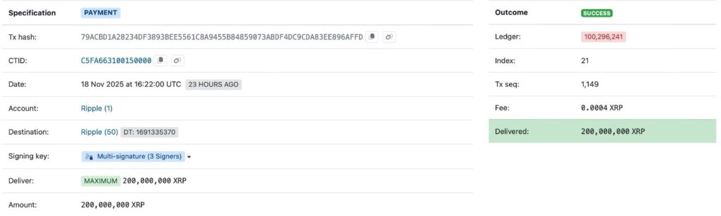 200,000,000 XRP, worth roughly $445 million, was moved from a Ripple-controlled wallet to an unidentified address on Tuesday, November 18.