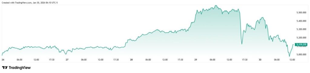 After more than doubling in value in just over two years and rocketing 27% in the initial weeks of 2026, Gold suddenly took a downward turn on January 29, plunging 7% within a day and seeing its price crash from $5,500 to $5,119.