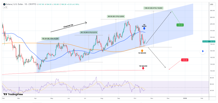 TradingShot’s model shows that Solana must hold above its 1D MA200 to avoid a breakdown of its bullish channel. A close below this level could trigger a reversal toward $105, while a holding firm could pave the way for a rebound toward $278.