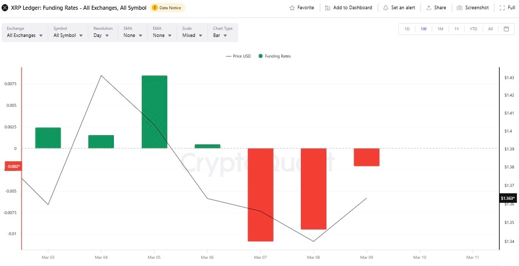 The XRP derivatives funding rate skyrocketed by more than 311% in the past 24 hours as the altcoin surged over 4.4% to trade above $1.43 on Tuesday, March 10, 2026.