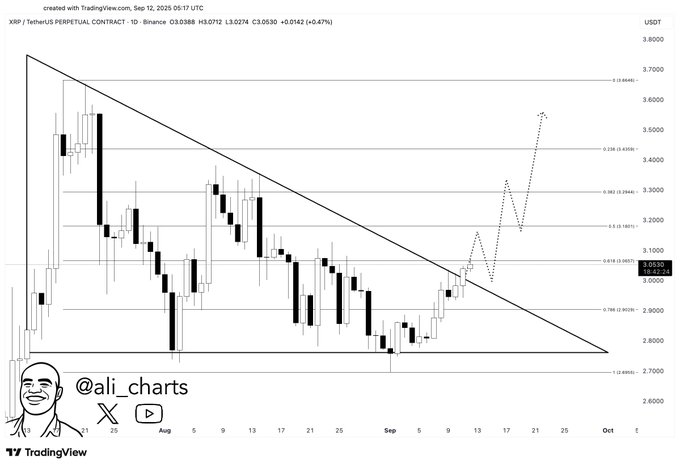 As for XRP’s next move, analyst Ali Martinez noted that after breaching resistance at $3.05, the token is now poised for higher levels. His outlook highlights that the breakout marks a decisive move above a descending trendline that had capped gains for weeks, signaling renewed strength in XRP’s structure.
