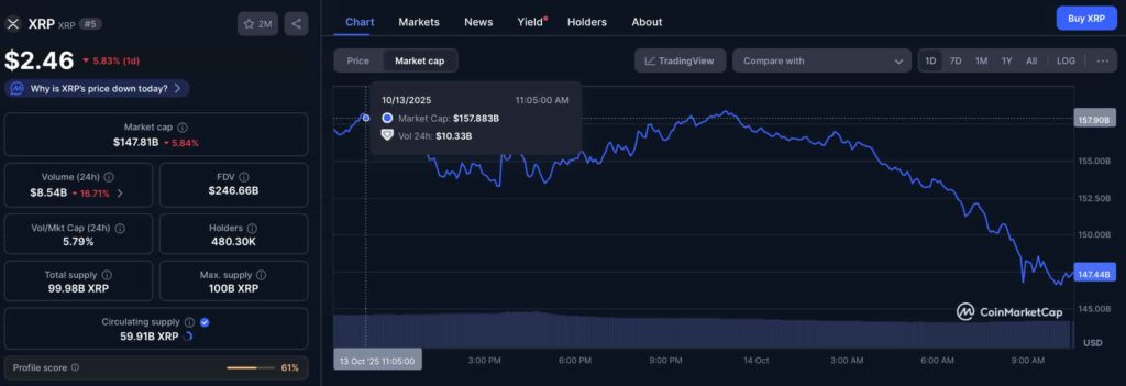 At press time on October 14, XRP was changing hands at $2.46, down 6.56% in the past 24 hours and more than 16% over the past week. The token’s market capitalization has fallen from $178 billion seven days ago to just $147.8 billion, underscoring the speed and depth of the decline.