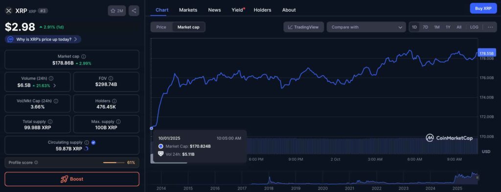 XRP investors woke up to a very different market today. In just 24 hours, the token added $8 billion to its market capitalization, climbing from $170.8 billion to $178.8 billion. XRP price followed suit, advancing nearly 3% to $2.98.