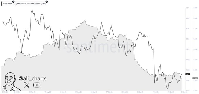 Specifically, whales collectively sold around 70 million XRP, worth approximately $178 million, over the past 48 hours, according to on-chain data from Santiment shared by Ali Martinez in an X post on October 25.