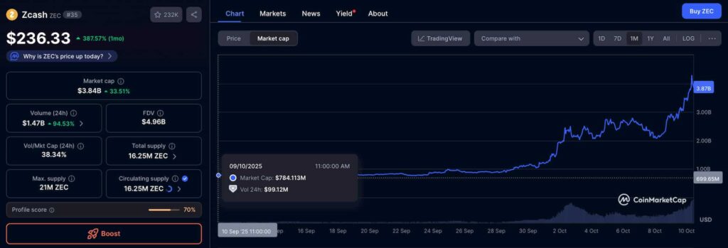 The rally lifted ZEC’s market cap to $3.84 billion, compared with just $784 million on September 10, highlighting renewed institutional and retail interest in privacy-focused cryptocurrencies.